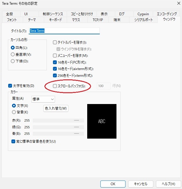 ・スクロールバッファ:OFF ※画面のちらつきを抑えるため、画面は消去せずに上書きしている。このための設定。
