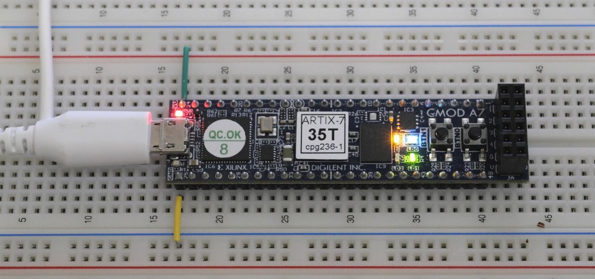 動作確認に使用した Digilent Inc.製、Cmod A7-35T (搭載FPGA:Artix-7)では、PCとはUSBで接続可能。