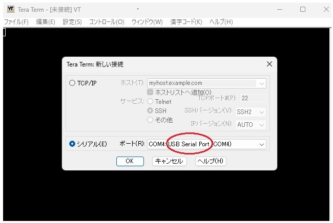 「シリアル」ポート設定としてUSBを選択 (COM番号はPCに依存する)
