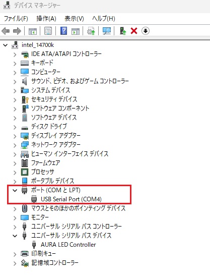 「シリアル」ポートの設定としてUSBを選択 (COM番号はPCに依存する)